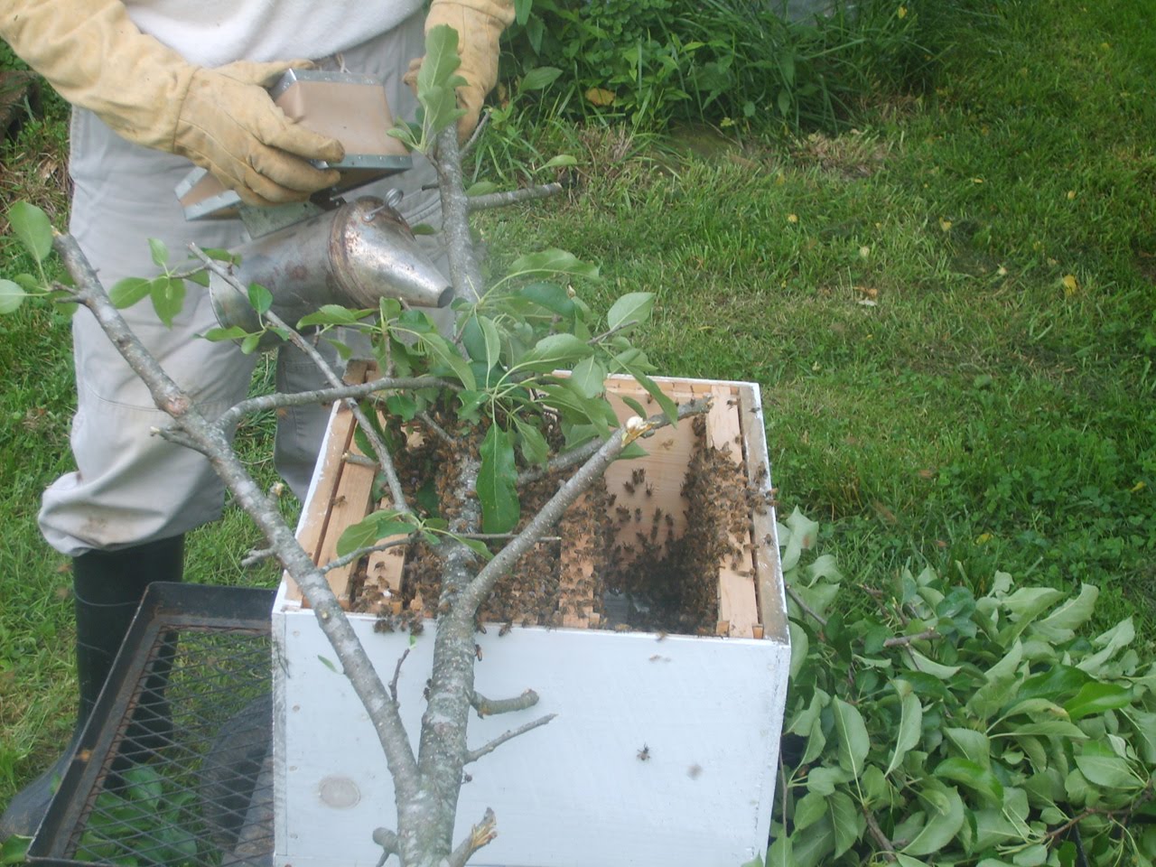 Friday evening after work, we rushed home to hurry through chores, and put the finishing touches on housecleaning. We had weekend company on the way, and a sinkful of dishes. As I looked out the kitchen window- I knew there was going to be a change of plans. I saw a be swarm of honey bees pretty close to the top of one of the apple trees.
